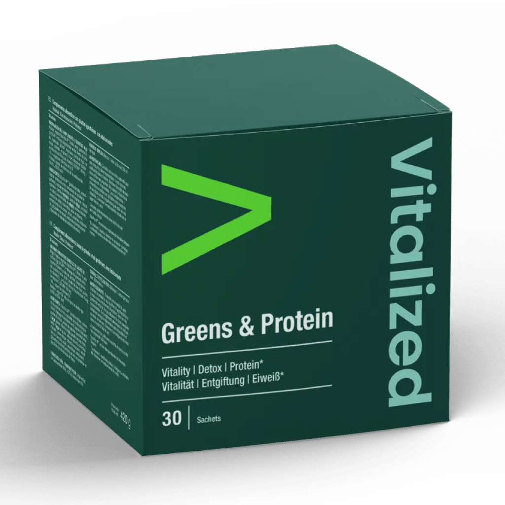 Greens & Protein van Vitalized is een uitgebalanceerd dagelijks supplement in handige sachets, met een combinatie van hoogwaardige plantaardige eiwitten en een krachtige mix van groene superfoods. Elke portie bevat 8 gram eiwit uit tuinbonen, rijst en kikkererwten, en ruim 5 gram groentepoeders, zoals spirulina, chlorella en broccoli. Daarnaast levert het 40 mg vitamine C uit natuurlijke bronnen zoals acerola.
