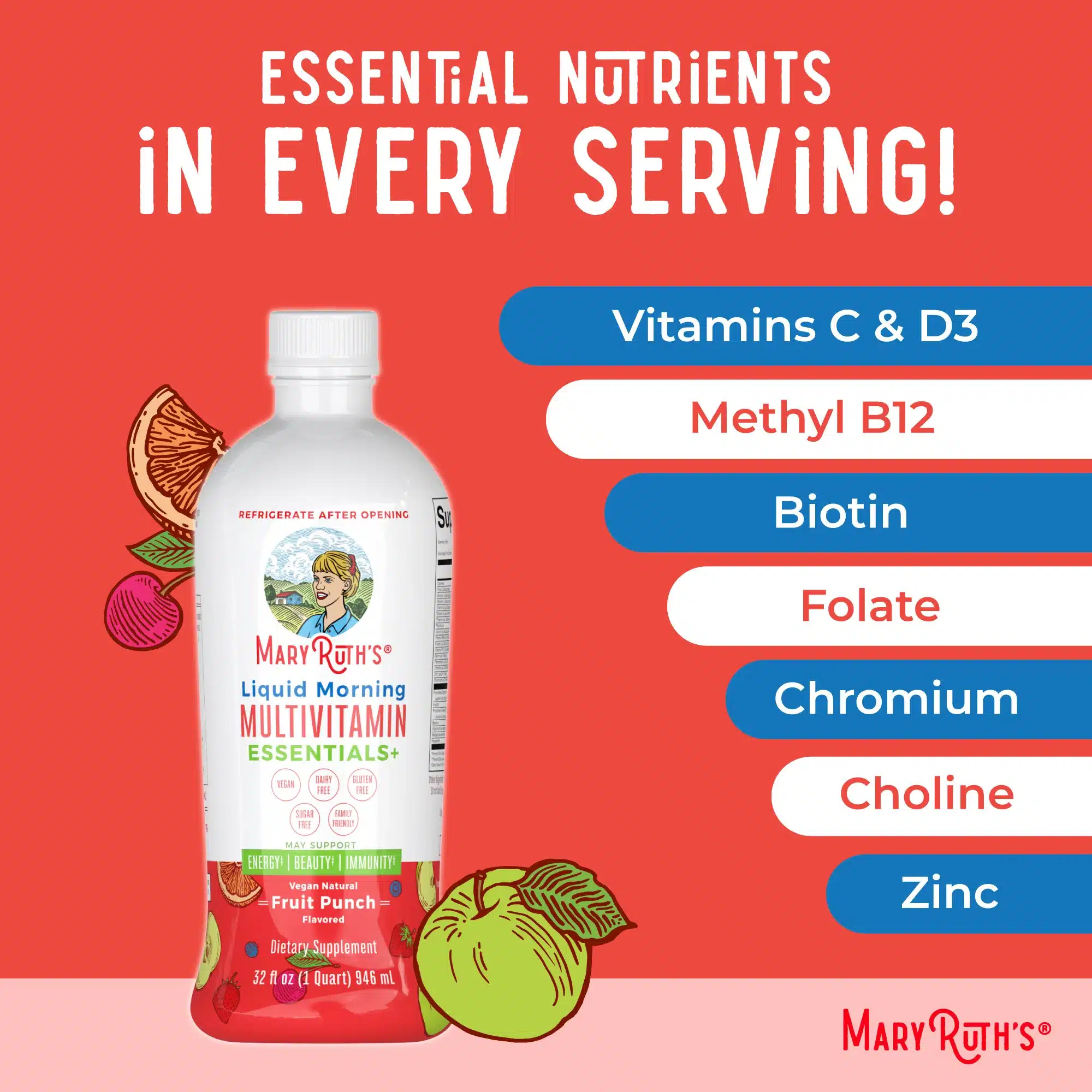 Morning Multivitamine Vloeibaar Fruit Punch van MaryRuth’s (Liquid Morning Multivitamin Essentials+) is een vloeibare multivitamine die is ontwikkeld voor dagelijks gebruik en die volgens de fabrikant geschikt is voor het hele gezin vanaf 1 jaar. De formule combineert vitamines en mineralen met aanvullende stoffen zoals inositol, MSM, betaïne, hesperidine en choline. Daarnaast bevat de formule vitamine K2 (als MK-7).
