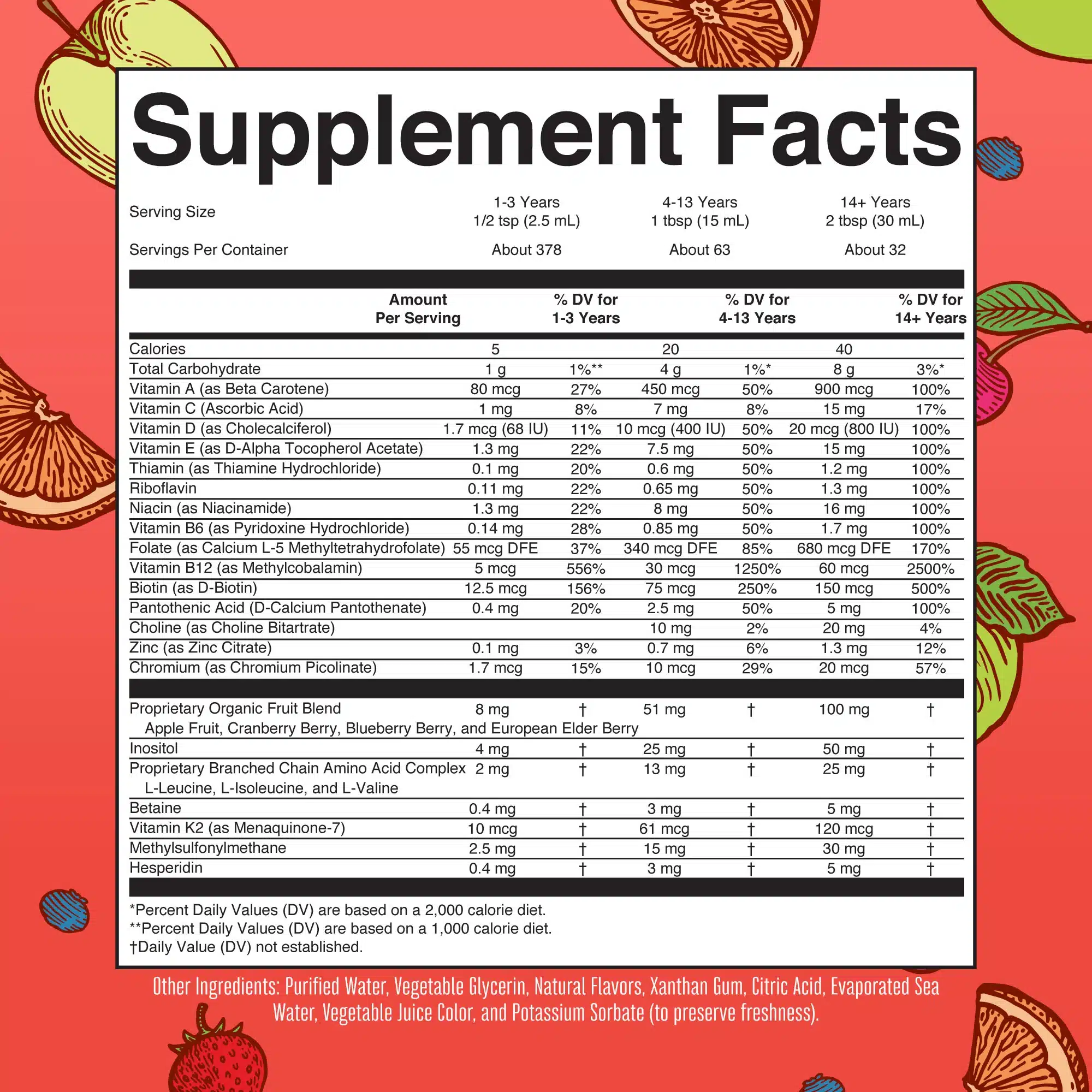 Beschikbaar in een handige hersluitbare fles met vloeibare multivitamine (Fruit Punch-smaak).
