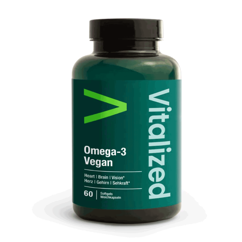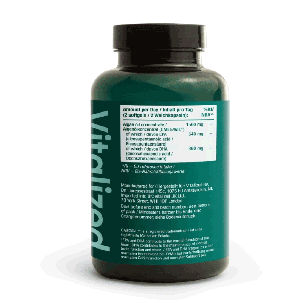 Omega-3 Vegan van Vitalized biedt een volwaardige combinatie van EPA en DHA uit algenolie, een duurzaam alternatief voor visolie.