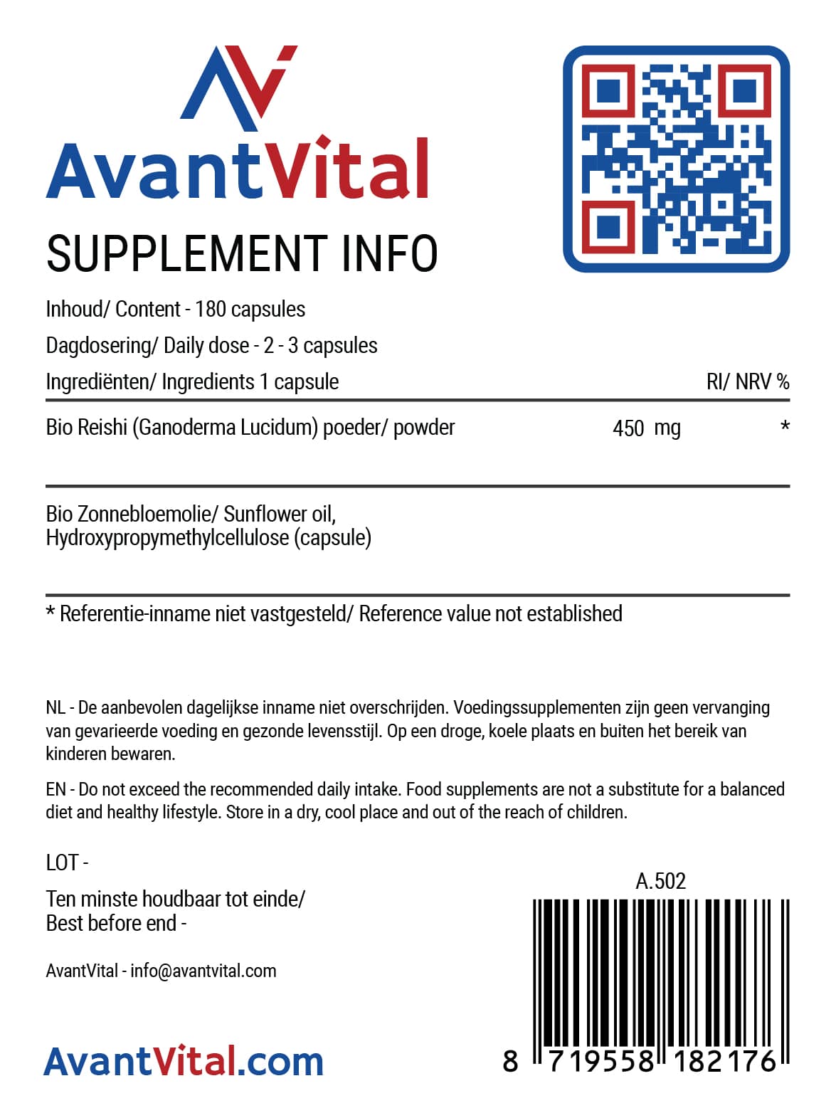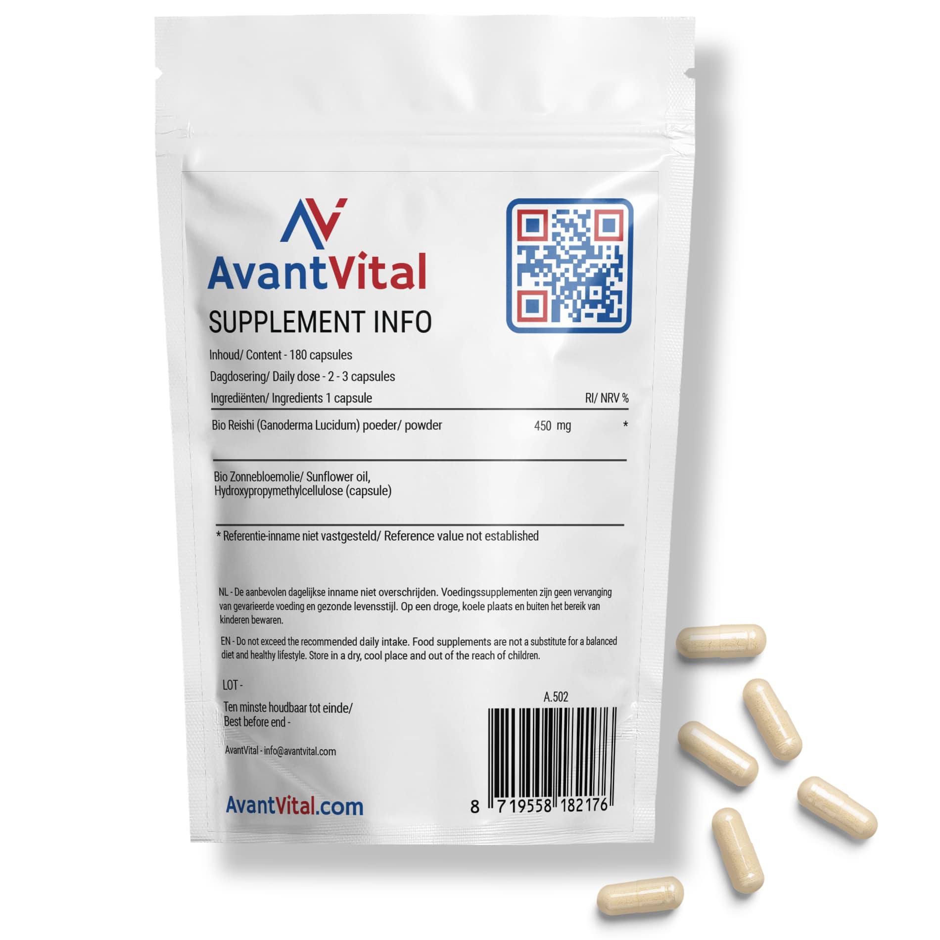 Elke capsule bevat 450 mg Reishi-extract van hoge kwaliteit. AvantVital’s Reishi supplementen onderscheiden zich door hun zuiverheid, nauwkeurigheid en consistente dosering. Bovendien bieden wij dit supplement aan in een praktische, hersluitbare verpakking met 180 capsules.
