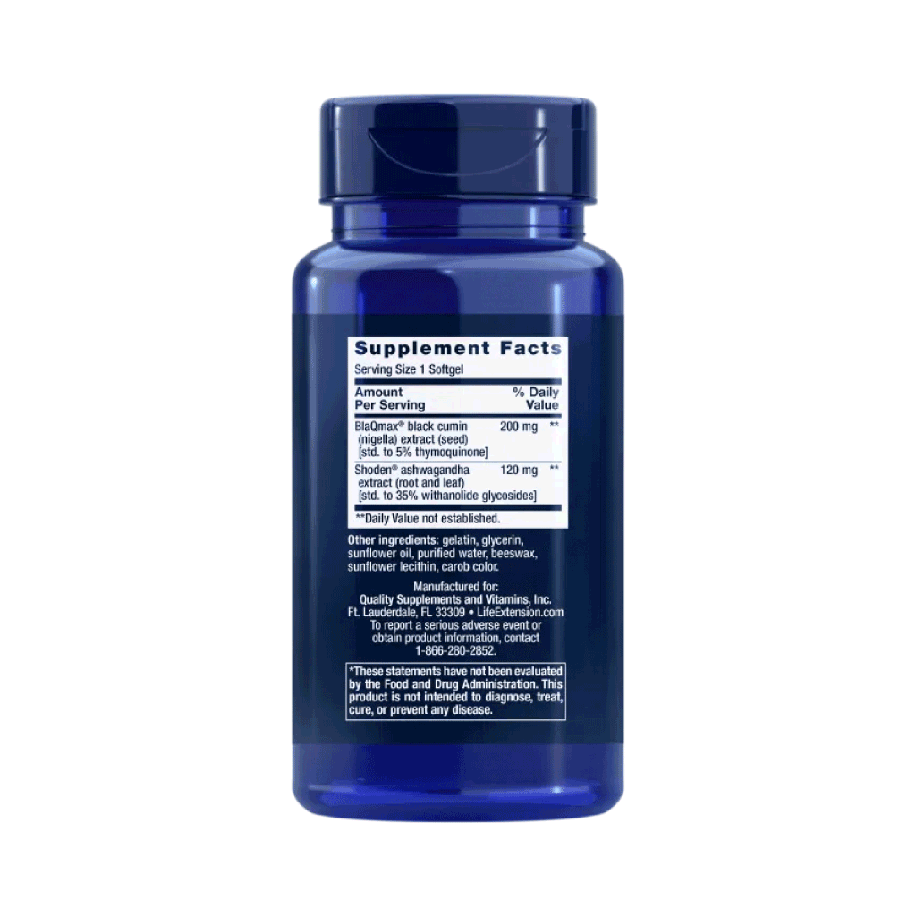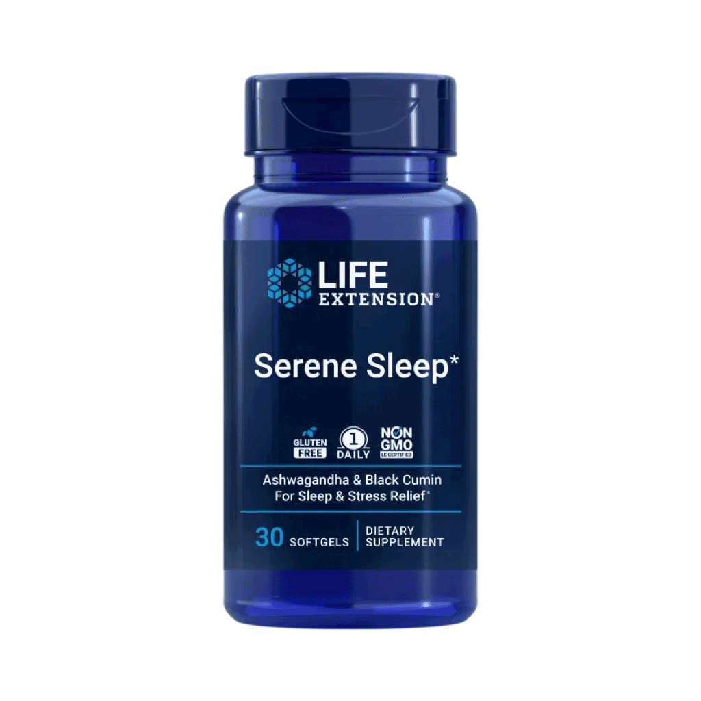 Serene Slaap van Life Extension is een dagelijkse softgel met een kruidenmix van ashwagandha (Shoden®) en zwarte komijn (BlaQmax®).