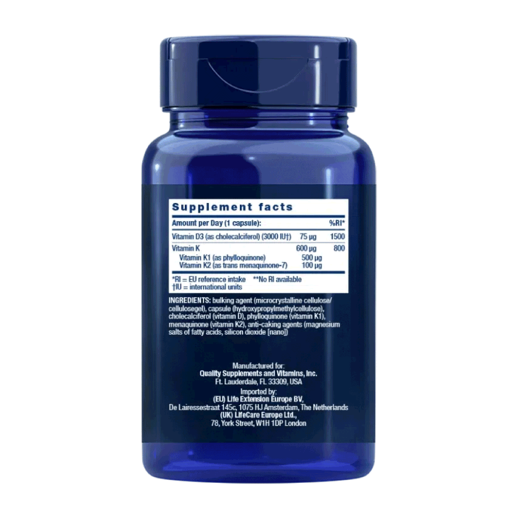 In deze tijd, waarin we allemaal zoeken naar manieren om onze botten, spieren en het immuunsysteem te ondersteunen, biedt Life Extension een geavanceerd supplement aan met 75 µg vitamine D3, 500 µg vitamine K1 en 100 µg vitamine K2 (als MK-7), speciaal ontwikkeld voor algehele gezondheid.